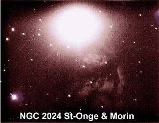 Un autre objet du "New General Catalog", NGC 2024, est une nébuleuse tout près de l'étoile ZETA, qui est l'étoile de gauche (EST) des trois étoiles alignées d'est en ouest au centre de la constellation. Cette nébuleuse s'observe dans des télescopes d'amateurs de grands diamètres et bien sûr, dans un ciel bien noir.