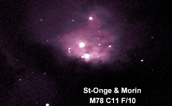 Voici maintenant une petite nébuleuse par réflexion, (i.e. qui réfléchit la lumière d'une étoile), dans la partie nord de la constellation: M78. Cette nébuleuse est constituée de quelques fragments pâles. Elle est assez difficile à voir aux jumelles, mais un ciel bien noir nous laisse la découvrir dans un télescope de petite taille.